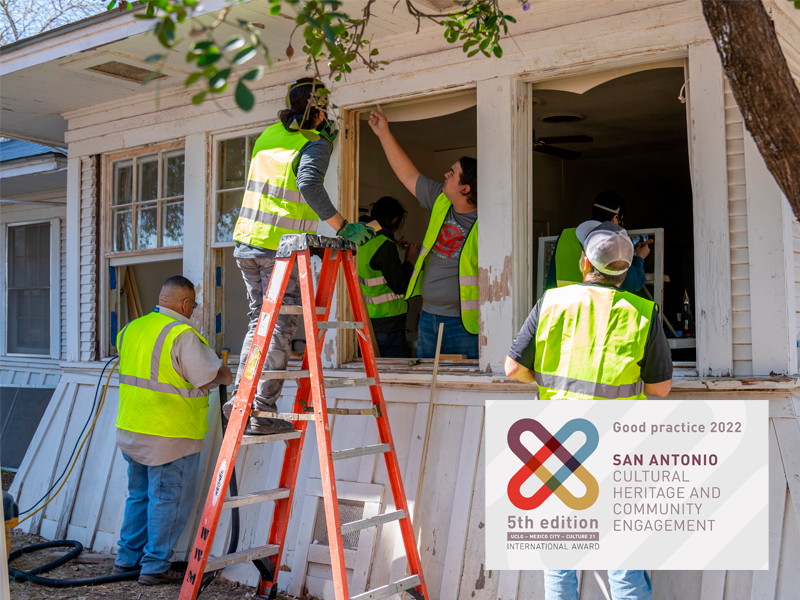 - El programa contempla la reutilización continua de los edificios y sus materiales como base para la prosperidad económica local, la equidad social y la administración urbana y natural frente al cambio climático. El cambio climático afectará de forma desproporcionada a las comunidades de clase trabajadora y a las personas de color, y contribuirá a la pérdida de patrimonio de estas comunidades, mermando así un medio fundamental para garantizar la resiliencia. La ciudad de San Antonio adoptó un Plan de Acción y Adaptación Climática. Otros esfuerzos políticos recientes incluyen una Ordenanza de Deconstrucción cuyo objetivo es mitigar los impactos negativos de la demolición que incluyen los residuos de los vertederos, la contaminación del aire y el aumento de la dependencia de materiales vírgenes. En términos generales, este programa está desarrollando un ecosistema de reutilización de edificios localizado, inclusivo y culturalmente arraigado. La ciudad también ha diseñado programas prácticos y centrados en el patrimonio que tienen como objetivo reducir las desigualdades que afectan a las comunidades de color olvidadas durante mucho tiempo, lo que provoca su falta de acceso a los beneficios financieros de la conservación, incluida la seguridad de la vivienda y la vivienda asequible.