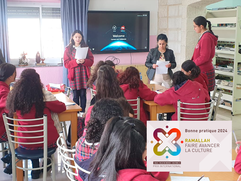 - Programas culturales participativos en escuelas de Ramala dirigidos por artistas y escritores profesionales centrados en la “Nakba de 1948”, la “ (emergente); y las “Lecturas en el patrimonio cultural”. Este último está centrado en los edificios históricos ocupados en 1948 en Ramala por los refugiados que se vieron obligados a emigrar de las ciudades. Los alumnos pasan por lecturas, debates, imaginación, creación y presentación, y pueden elegir el medio que deseen utilizar (literatura, teatro, música, danza, pintura, ilustración, fotografía, películas, podcasts, etc.). Estos programas se diseñaron mediante un proceso